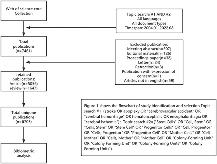 方法:我們使用Web of Science核心合集檢索2004年至2022年間發(fā)表的有關(guān)中風(fēng)干細(xì)胞的相關(guān)文章。使用CiteSpace、VOSviewer和R軟件包“bibliometrix”進(jìn)行分析,以確定出版物產(chǎn)出、國(guó)家/地區(qū)、機(jī)構(gòu)、作者/共同被引作者、期刊/共同被引期刊、共同被引參考文獻(xiàn)和關(guān)鍵詞。最終,6,703條記錄被納入分析。具體文獻(xiàn)篩選流程見(jiàn)圖1。