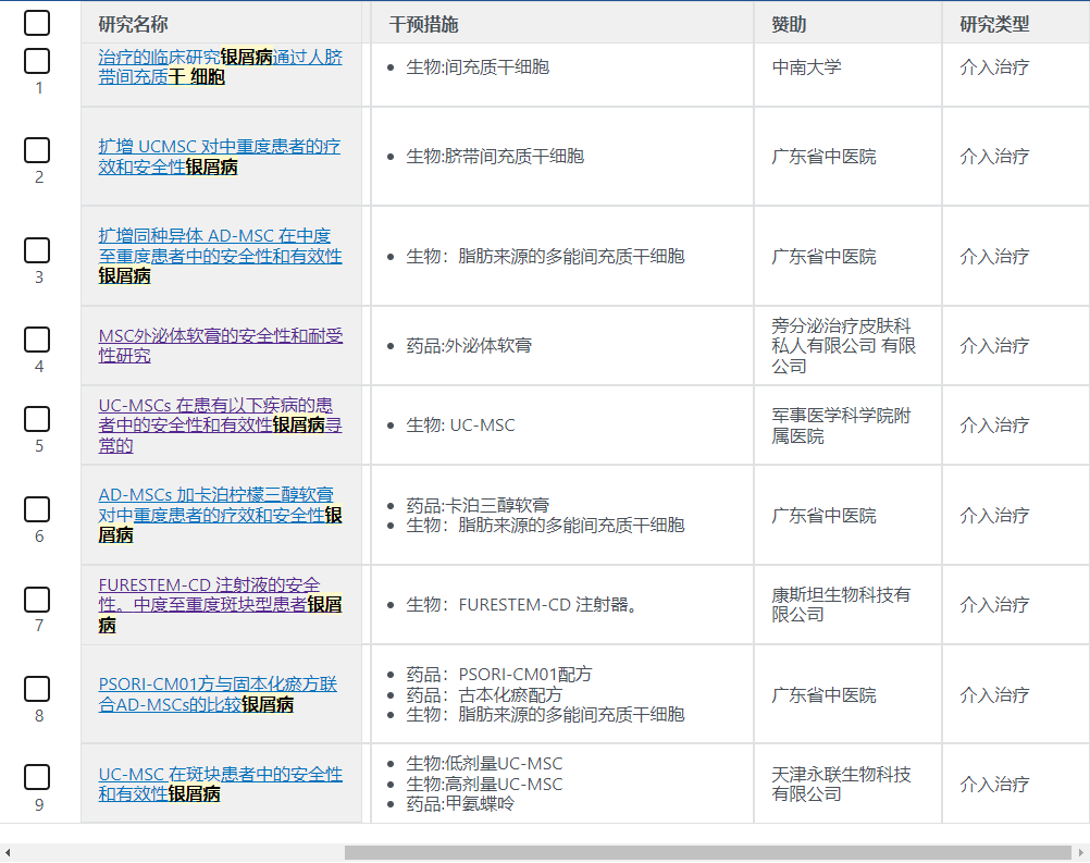 截止2023年8月,在美國國立衛生研究院的最大臨床試驗注冊庫clinicaltrials.gov網站上注冊的有關干細胞治療銀屑病的臨床研究項目有9項。其中在國內的臨床研究有7項。