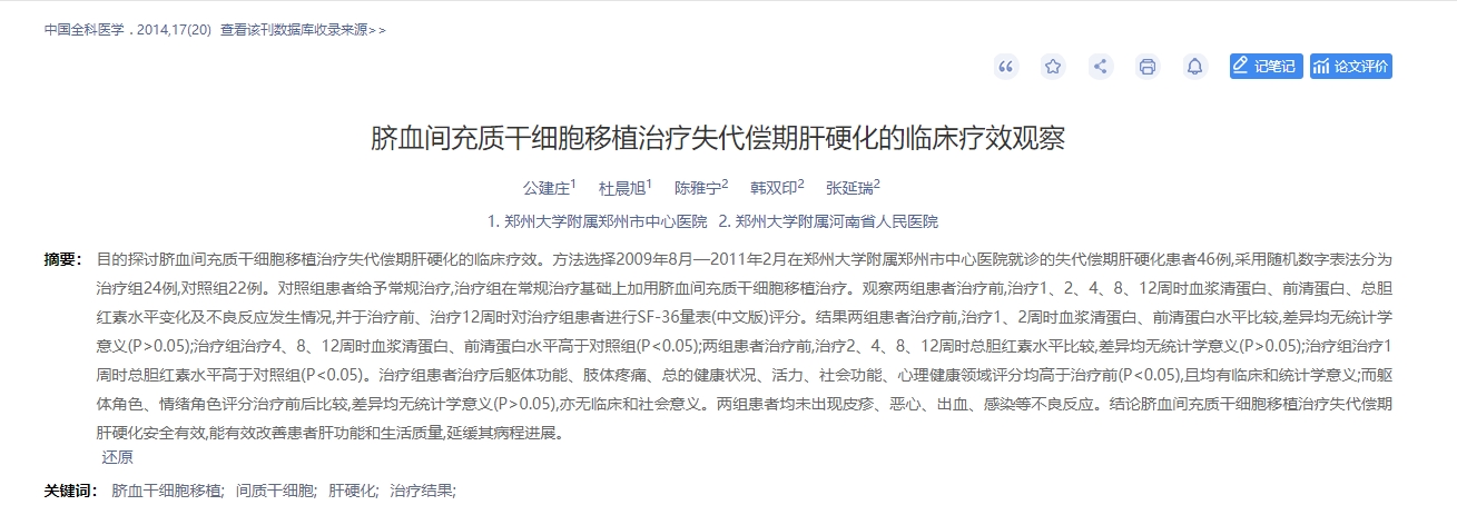 2014年,中國全科醫學在中國知網發表了一篇臍血間充質干細胞移植治療失代償期肝硬化的臨床療效觀察的論文[2]。