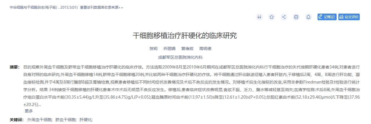 2015年,中華細胞與干細胞雜志(電子版)發表了一篇干細胞移植治療肝硬化的臨床研究的論文[3]。