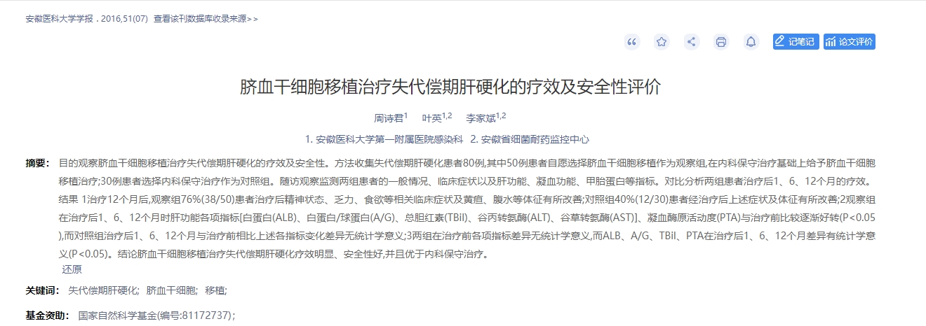 2016年,安徽醫科大學學報報道了一篇臍血干細胞移植治療失代償期肝硬化的療效及安全性評價的臨床研究綜述[4]。