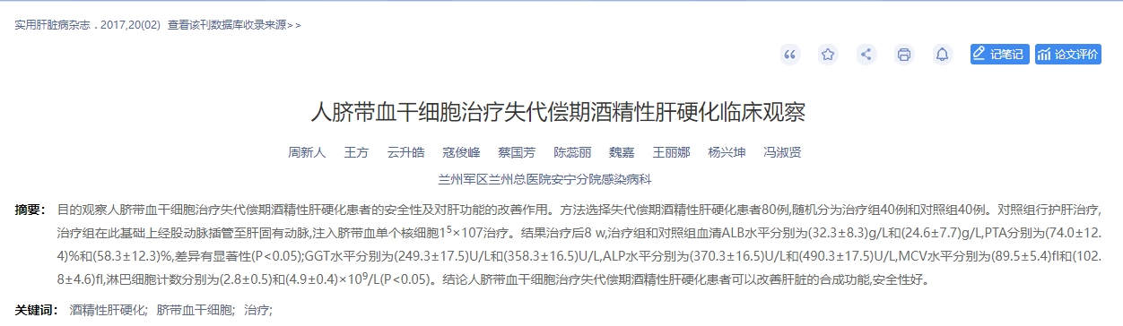 2017年,實用肝臟病雜志刊發了一篇人臍帶血干細胞治療失代償期酒精性肝硬化臨床觀察的文章[5]。