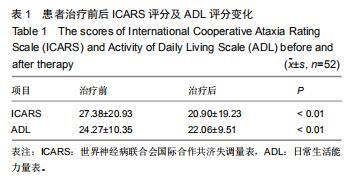 本組患者治療后1個(gè)月與治療前比較,ICARS 及 ADL 明顯降低(P<0.01)。