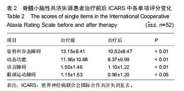 除1例共濟(jì)失調(diào)患者治療無效外,其余患者均有效,表現(xiàn)為行走和站立不穩(wěn)、運(yùn)動(dòng)遲緩、上肢精細(xì)動(dòng)作障礙、書寫困難、構(gòu)音障礙等臨床癥狀得到改善。