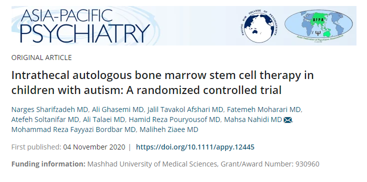 近年來,馬什哈德醫(yī)科大學在《Wiley Online Library》雜志上發(fā)布了一篇《自閉癥兒童鞘內自體骨髓干細胞治療:一項隨機對照試驗》,結果顯示鞘內注射自體骨髓間充質干細胞似乎是安全可行的,但在治療兒童自閉癥方面的臨床療效有限。