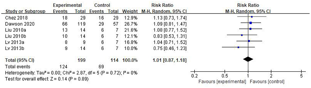 結果:符合納入標準的5項研究被納入當前分析。使用康復治療作為參考標準進行薈萃分析。數據顯示,干細胞組的兒童自閉癥評定量表得分顯著低于對照組(WMD:-5.96;95%CI [-8.87,-3.06];p?< 0.0001)。Clinical Global Impression評分綜合效應量RR=1.01, 95%CI [0.87, 1.18], Z=0.14 (?p=0.89),Clinical Global Impression的有效率在干細胞組分別為62%和60%,分別為對照組。各組不良反應發生事件(RR=1.55;95%CI=0.60~3.98;p=0.36),干細胞組與對照組的不良反應發生率無顯著差異。