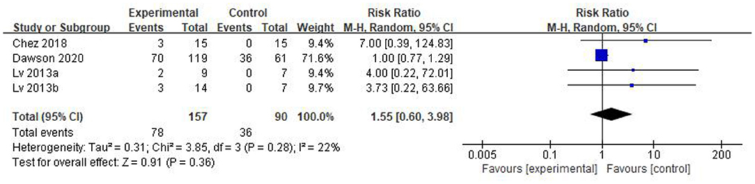 圖6中的森林圖反映了各組不良反應的發生事件[RR=1.55;95%CI = (0.60, 3.98); p=0.36; 圖6],干細胞組與對照組的不良反應發生率無顯著差異,異質性檢驗p=0.28;我2=22%。基于森林地圖,我們有視覺異常值。敏感性分析發現,道森等人的研究是一個異常值,是異質性的原因。而排除Dawson等人的研究后,結果更穩定 [RR=4.70;95%CI= (0.90, 24.63); p=0.07;異質性檢驗p= 0.95; 我2=0%]。