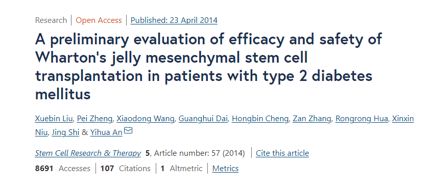 此外,解放軍總醫(yī)院內(nèi)分泌科母義明教授、生物治療中心韓衛(wèi)東教授等人也在Stem Cell Res Ther期刊上發(fā)表了一項(xiàng)單中心、隨機(jī)、雙盲、安慰劑對(duì)照試驗(yàn)的結(jié)果,考察了臍帶間充質(zhì)干細(xì)胞治療2型糖尿病的有效性和安全性。