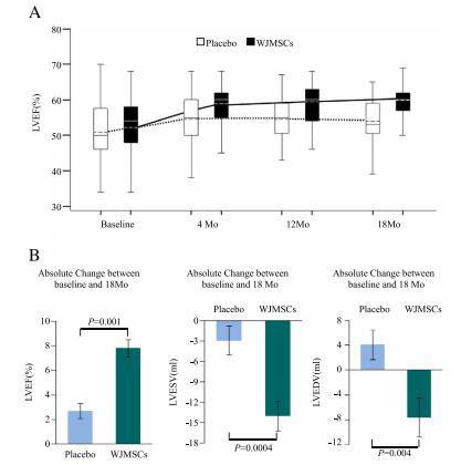 在隨訪的第3、6和12個月時經胸超聲心動圖和心臟MRI評估,只有經臍帶間充質干細胞治療組顯示出左心室射血分數的顯著改善。兩組間超聲心動圖左心室射血分數從基線到第12個月的變化差異顯著。