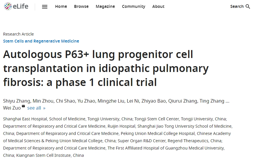 近期,以中國同濟大學醫學院上海市東方醫院(以下簡稱我們)為牽頭的機構進行了一項自體P63+肺祖細胞移植治療特發性肺纖維化:1期臨床試驗。該臨床試驗結果發表在期刊雜志《Stem Cells and Regenerative Medicine》上[1]。