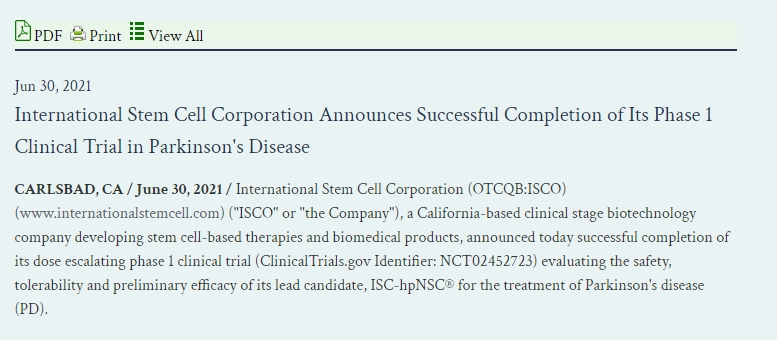 2021年6月30日,一家總部位于加利福尼亞州的臨床階段生物技術(shù)公司,致力于開(kāi)發(fā)基于干細(xì)胞的療法和生物醫(yī)學(xué)產(chǎn)品,宣布成功完成其劑量遞增1期臨床試驗(yàn)(ClinicalTrials.gov標(biāo)識(shí)符:NCT02452723),試驗(yàn)對(duì)象為12名患者。評(píng)估其主要候選藥物ISC-hpNSC?用于治療帕金森病 (PD) 的安全性、耐受性和初步療效。