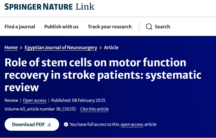 近日,國際期刊雜志《?Egyptian Journal of Neurosurgery》發(fā)表了一篇“Role of stem cells on motor function recovery in stroke patients: systematic review”的臨床研究綜述,該綜述旨在進(jìn)行全面的系統(tǒng)評價(jià)和薈萃分析,以評估皮下注射對中風(fēng)運(yùn)動(dòng)恢復(fù)的治療潛力。