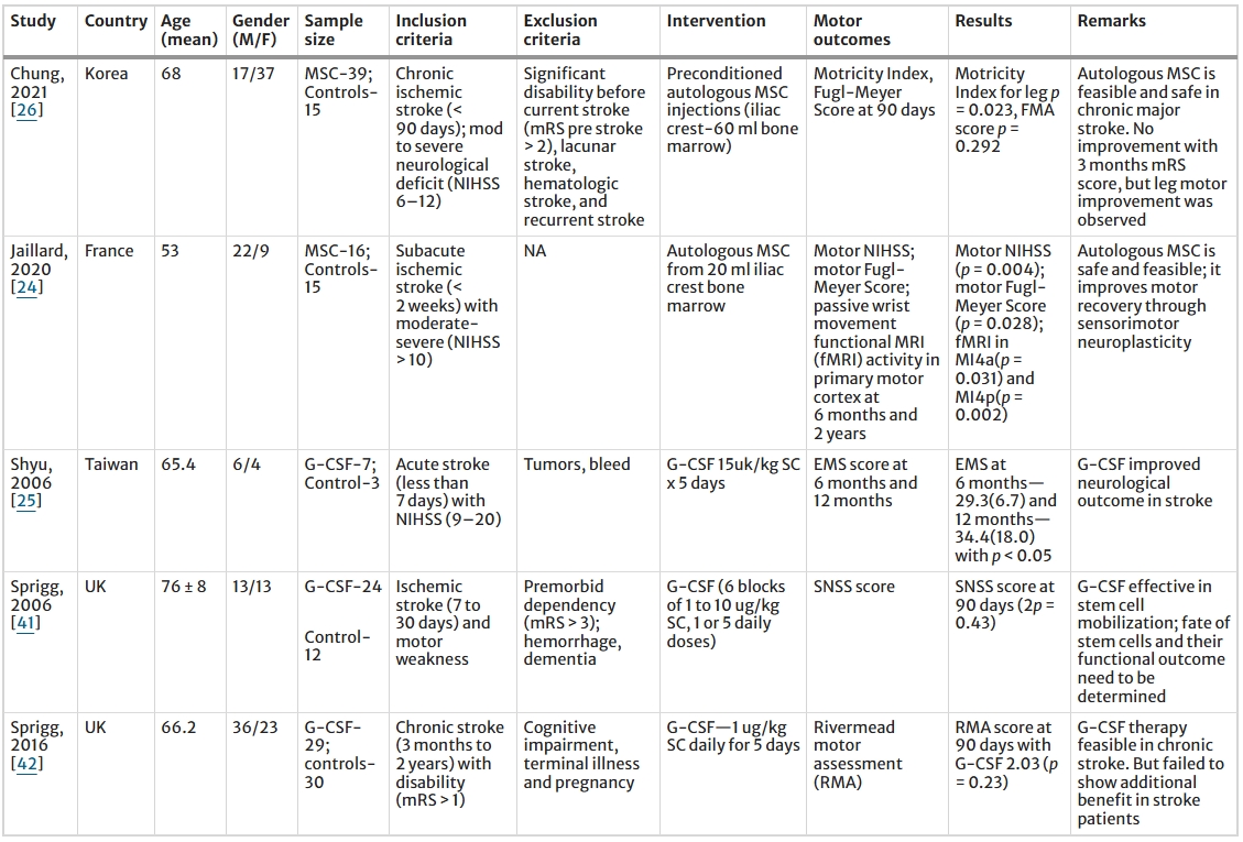 美國國立衛(wèi)生研究院卒中量表 (NIHSS) 被用作殘疾的納入標(biāo)準(zhǔn)(n=3),兩項(xiàng)研究使用了改良Rankin量表 (mRS)。這些研究的共同排除標(biāo)準(zhǔn)包括出血性卒中(n?=4)和其他醫(yī)學(xué)合并癥。兩項(xiàng)研究中的間充質(zhì)干細(xì)胞 (MSC) 均從髂嵴中提取。一項(xiàng)研究以1×106kg的劑量注射MSC,而另一項(xiàng)研究則通過靜脈注射了1億至3億個(gè)MSC。三項(xiàng)研究均采用皮下注射粒細(xì)胞集落刺激因子(G-CSF),其中一項(xiàng)研究的劑量為1μg/kg,持續(xù)5天,另一項(xiàng)研究的劑量為15μg/kg,持續(xù)5天,還有一項(xiàng)研究的劑量為增量注射。