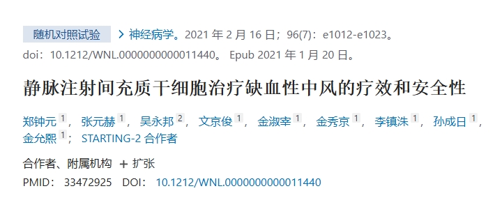 臨床案例一:2021年,期刊雜志《神經(jīng)病學(xué)》發(fā)表了一篇“靜脈間充質(zhì)干細(xì)胞治療缺血性卒中的療效和安全性”臨床研究文章。