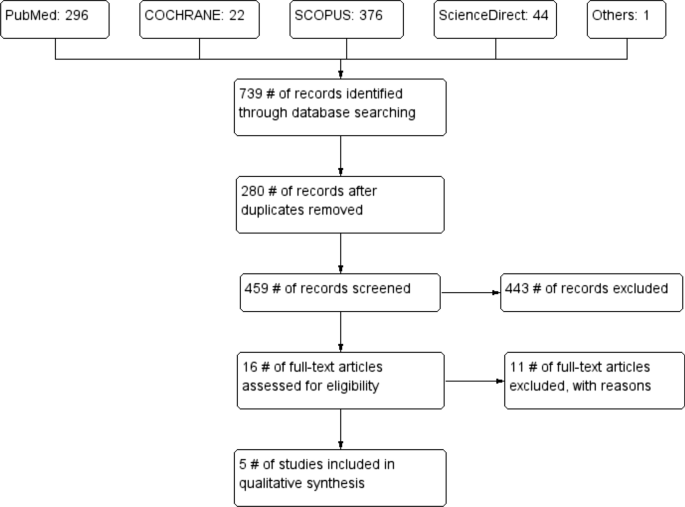 結(jié)果:采用上述檢索策略,我們共檢索到739篇文章。刪除280條重復(fù)記錄后,剩余459篇文章。進(jìn)一步篩選后,共排除443篇文章。隨后,對16篇文章進(jìn)行了全文檢索,其中排除11篇,排除原因詳見表1。此外,通過對已納入的5篇文章進(jìn)行引文檢索,又找到1篇文章,最終共計(jì)6篇文章可供定性綜合。