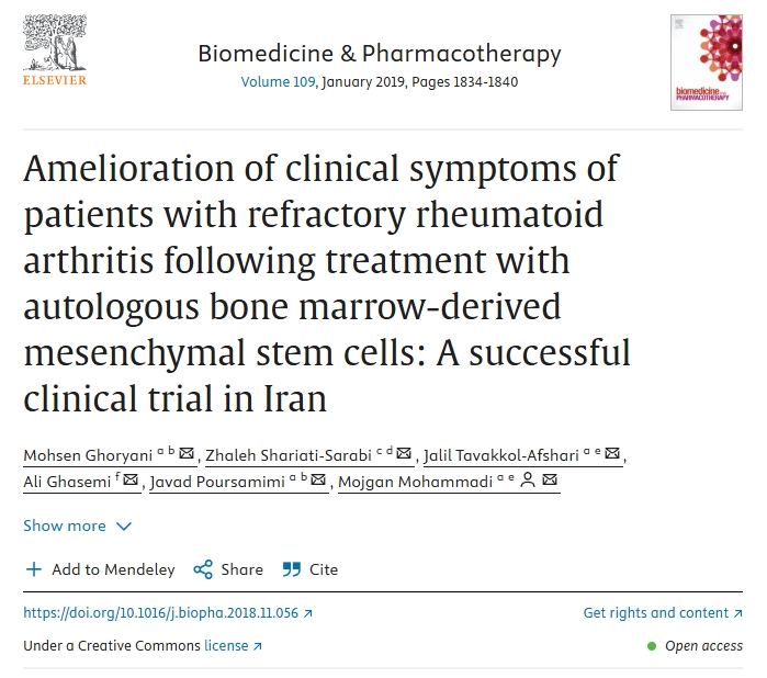2019年,伊朗科研人員在期刊雜志《生物醫(yī)學(xué)與藥物治療學(xué)》上發(fā)表了一篇“自體骨髓間充質(zhì)干細(xì)胞治療后難治性類風(fēng)濕性關(guān)節(jié)炎患者臨床癥狀改善的臨床試”的文章。
