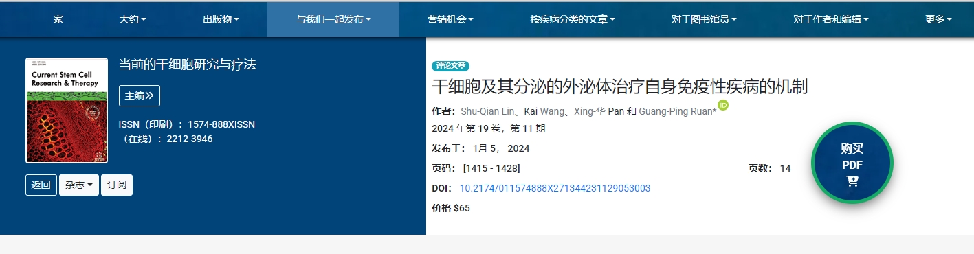 2024年,在國(guó)際期刊雜志《當(dāng)前的干細(xì)胞研究與療法》發(fā)表一篇關(guān)于”干細(xì)胞及其分泌的外泌體治療自身免疫性疾病的機(jī)制“的文章,該文章旨在幫助廣大患有自身免疫性疾病的患者了解干細(xì)胞及外泌體治療自身免疫性疾病的具體機(jī)制。