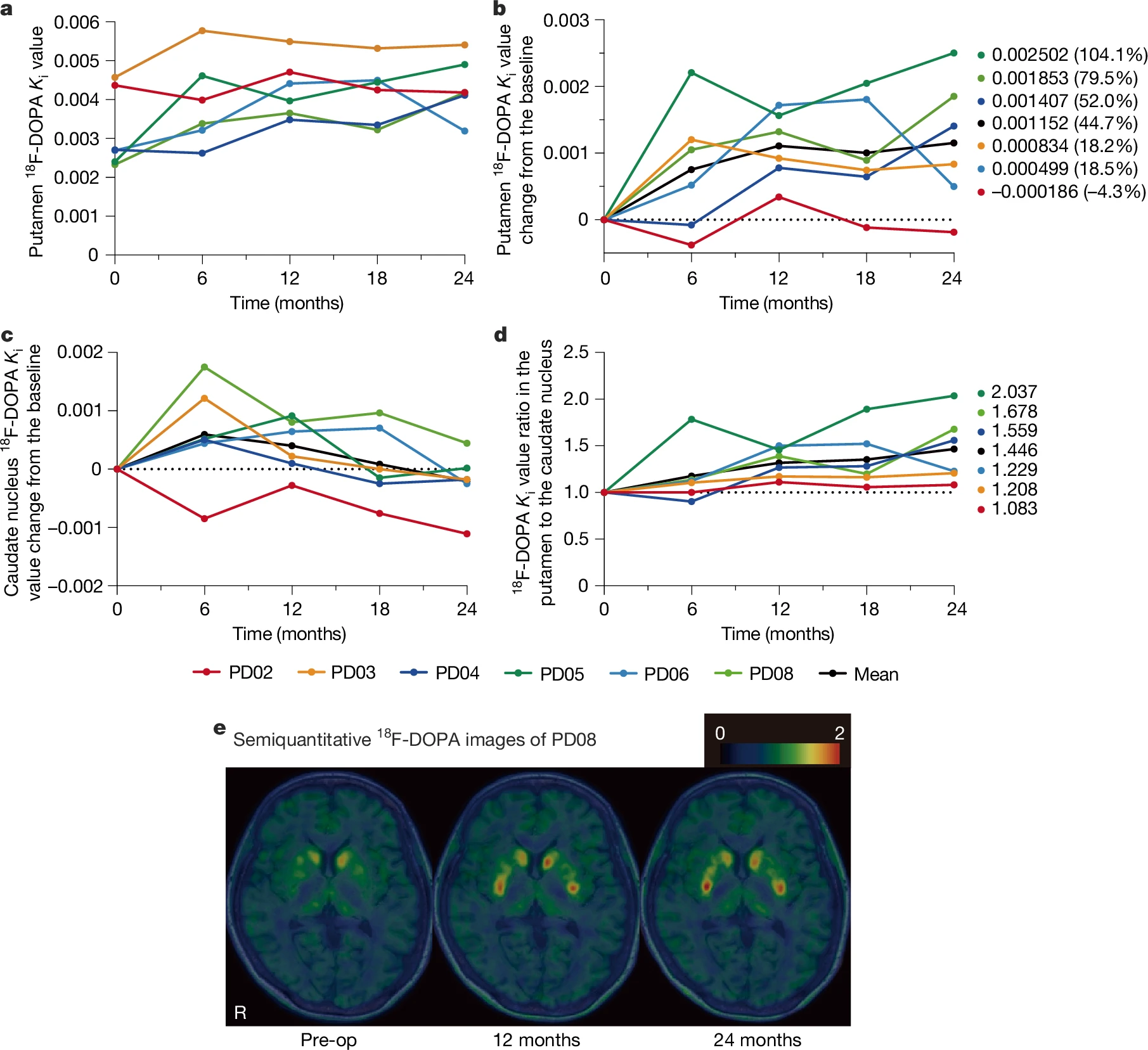 24個月時,殼核區域 18F-DOPA K?值總平均增加44.7%(從0.0032升至0.0043),其中高劑量組增幅達63.5%,低劑量組增加7.0%;8個高劑量移植殼核中7個出現 K?值升高,顯著高于低劑量組(4個中2個)。尾狀核 K?值則呈下降趨勢(圖