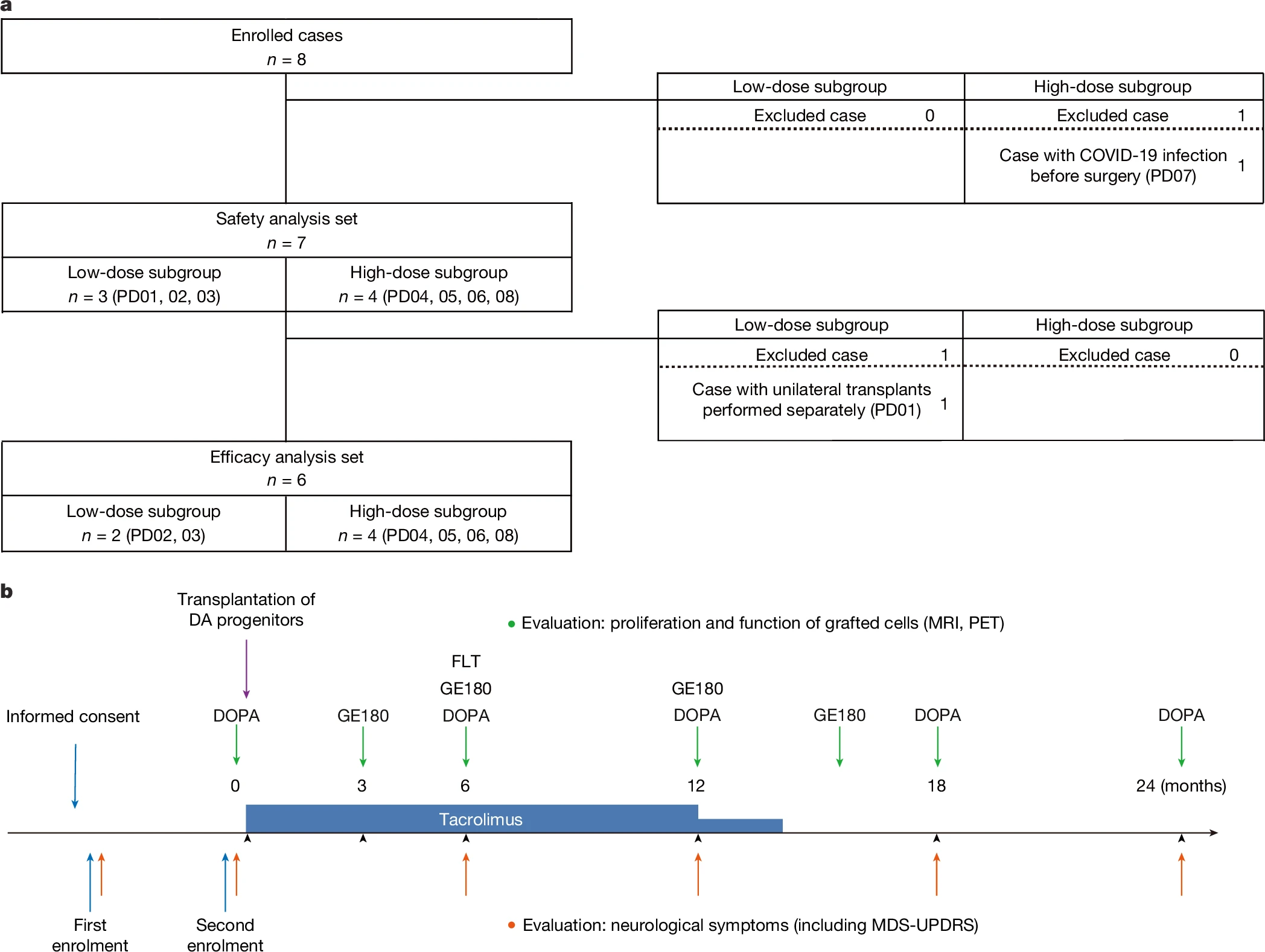 我們之前開發了一種從人類誘導多能干細胞中誘導DA神經元并分選DA祖細胞的方法。這些細胞在非人類靈長類帕金森病模型的大腦中產生了DA,并改善了它們的運動癥狀。在臨床前研究證實了其在致瘤性、毒性和生物分布方面的安全性后,我們獲得了日本政府和京都大學機構審查委員會的批準。在此,我們報告了2018年啟動的臨床試驗的結果。