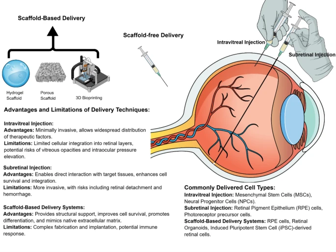 基于支架的遞送系統:基于支架的遞送系統涉及使用生物相容性材料(例如水凝膠或聚合物支架)在移植過程中支撐干細胞。這些系統通過模擬天然細胞外基質來提高細胞存活率、促進分化并促進整合。例如,已開發出用于治療AMD視網膜下植入的載有RPE細胞的支架。此外,3D生物打印技術正在使創建能夠復制眼部組織結構的定制支架成為可能。基于支架的方法代表了克服細胞存活和定位相關挑戰的一種有希望的途徑。