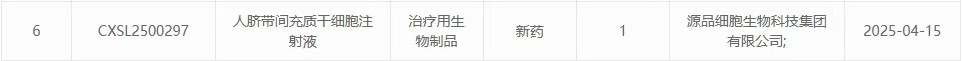 新增受理9:2025年04月15號,源品細胞生物科技集團有限公司的“人臍帶間充質干細胞注射液”的臨床試驗申請獲受理(受理號:CXSL2500297)。這是該款細胞注射液第1次獲得受理。