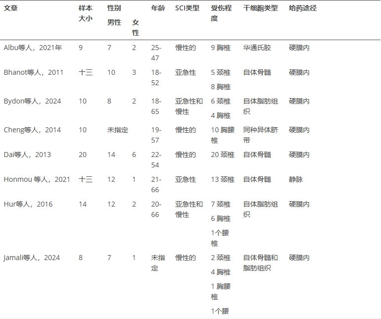 方法:納入接受胚胎干細胞、誘導性多能干細胞或間充質干細胞治療SCI的18-80歲患者。研究質量分別使用Cochrane偏倚風險2工具和紐卡斯爾渥太華量表 (Newcastle Ottawa scale) 進行評估,其中隨機研究為18-80歲。