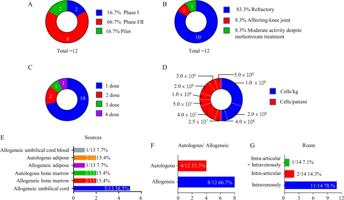 治療方案上:給藥次數以單次為主,多次給藥多為2-4劑,間隔1周至3個月(圖5C);細胞劑量多按體重計算(1–4×10?/kg),部分按固定細胞數(2.5×10?–3×10?)(圖5D);使用細胞來源包括臍帶(UC)、骨髓(BM)、脂肪(AD)和臍帶血(UCB)-MSCs(圖5E),其中UC-MSC多用于異體移植,BM/AD-MSC多用于自體移植(但BM-MSC獲取有創且效率較低)(圖5F);主要給藥途徑為靜脈注射(IV),關節內注射(IA)次之,僅1項研究聯合使用(圖5G)。