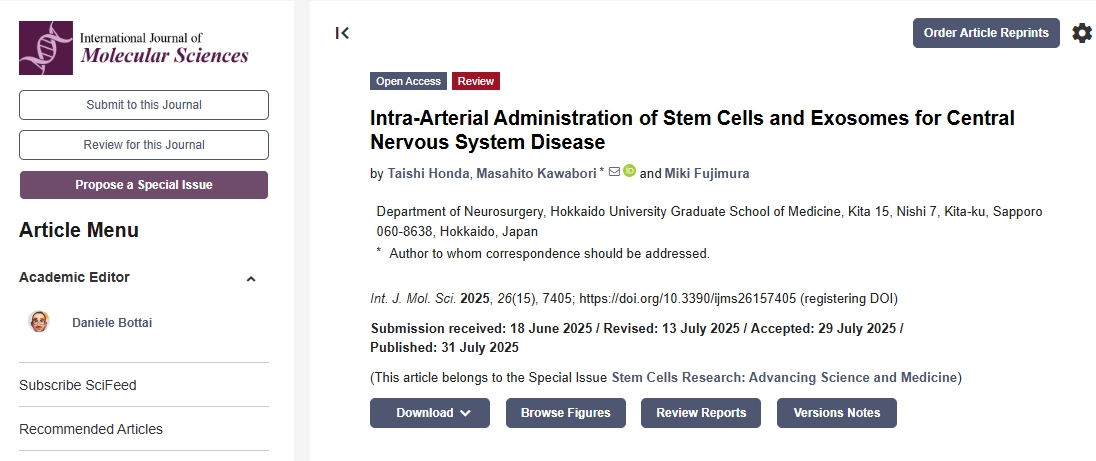 [1]:Honda, T.; Kawabori, M.; Fujimura, M. Intra-Arterial Administration of Stem Cells and Exosomes for Central Nervous System Disease. Int. J. Mol. Sci. 2025, 26, 7405. https://doi.org/10.3390/ijms26157405