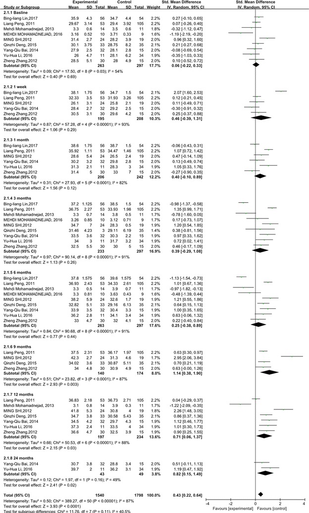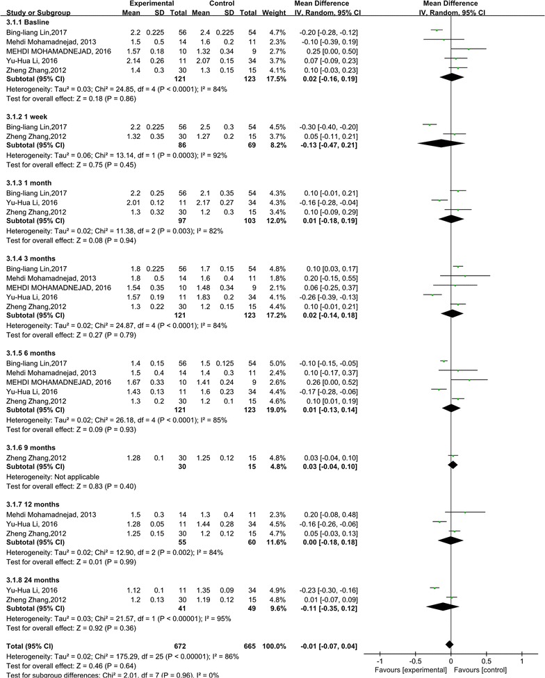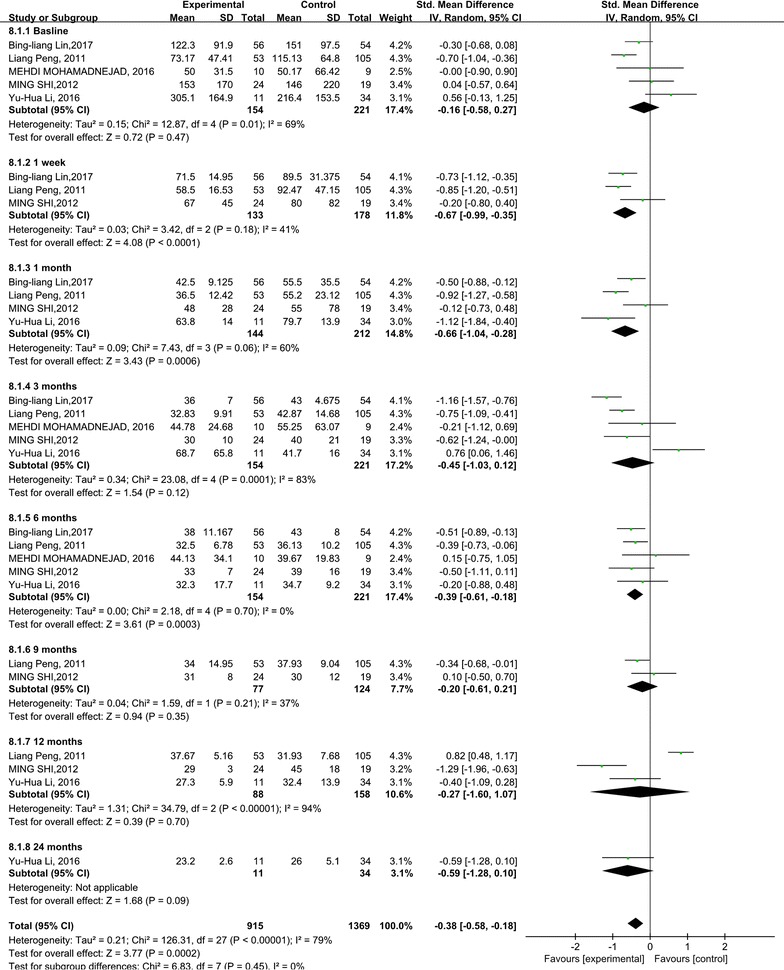 與對(duì)照組相比,干細(xì)胞治療后ALT水平顯著降低(p<0.00001)(圖5)。亞組分析顯示,干細(xì)胞治療組ALT水平也有所降低,在1周、1個(gè)月和6個(gè)月時(shí)間點(diǎn)均低于基線和相應(yīng)對(duì)照組。干細(xì)胞治療后9、12和24個(gè)月時(shí)ALT水平無(wú)顯著差異。關(guān)于1周、6和9個(gè)月時(shí)的ALT水平,未發(fā)現(xiàn)異質(zhì)性。但是,應(yīng)考慮1、3和12個(gè)月時(shí) ALT水平的異質(zhì)性。但這只能通過(guò)一兩項(xiàng)研究來(lái)解釋。