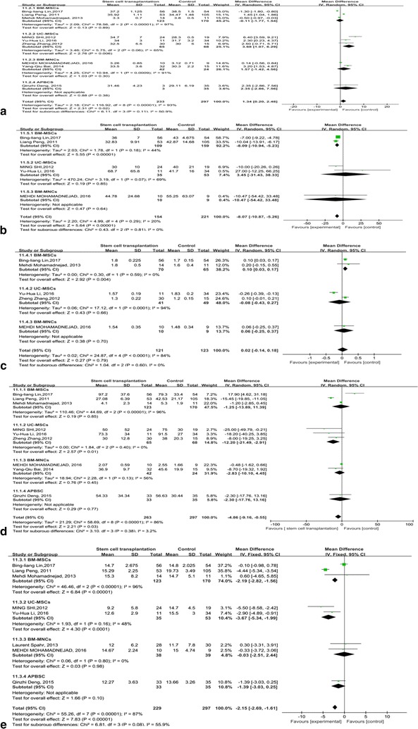 MELD評(píng)分主要用于評(píng)估終末期肝病的預(yù)后。我們觀察到干細(xì)胞治療組和對(duì)照組的MELD評(píng)分均有所下降。干細(xì)胞治療組和對(duì)照組之間存在顯著差異 (p =0.008)(圖6)。此外,盡管進(jìn)行了亞組分析,但這些研究的異質(zhì)性很高 (I 2 : 62–100%)。但這也可以僅通過(guò)一兩項(xiàng)研究來(lái)解釋。