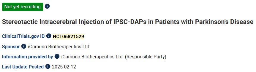 研究設計:一項開放標簽試驗,旨在通過殼核內注射的方式,將多巴胺能祖細胞(源自自體誘導多能干細胞)導入患者體內。試驗將招募12名患者,分為兩個劑量組(劑量未公開)。受試者為年齡在50至75歲之間、處于“關期”的帕金森病患者(PwP),其Hoehn-Yahr分期為3至4期。