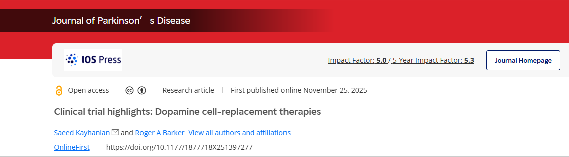 [1]:1.Kayhanian S, Barker RA. Clinical trial highlights: Dopamine cell-replacement therapies. Journal of Parkinson’s Disease. 2025;0(0). doi:10.1177/1877718X251397277.