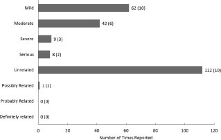 根據嚴重程度、嚴重性和與研究治療的關系分類的AE。共報告了113起。
