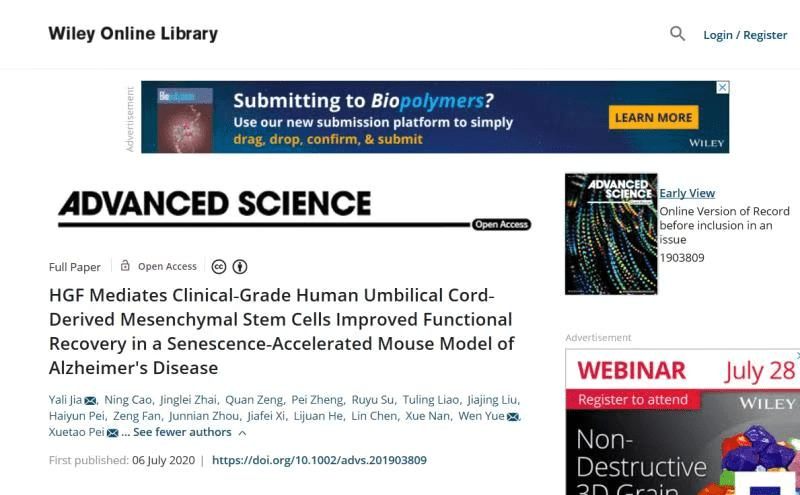 2020年7月6日,國際學術期刊《Advanced Science》在線發表了軍事科學院軍事醫學研究所和華南干細胞與再生醫學研究中心的最新研究成果“HGF介導臨床級人臍帶間充質干細胞改善功能恢復在衰老加速的阿爾茨海默氏病小鼠模型中”。