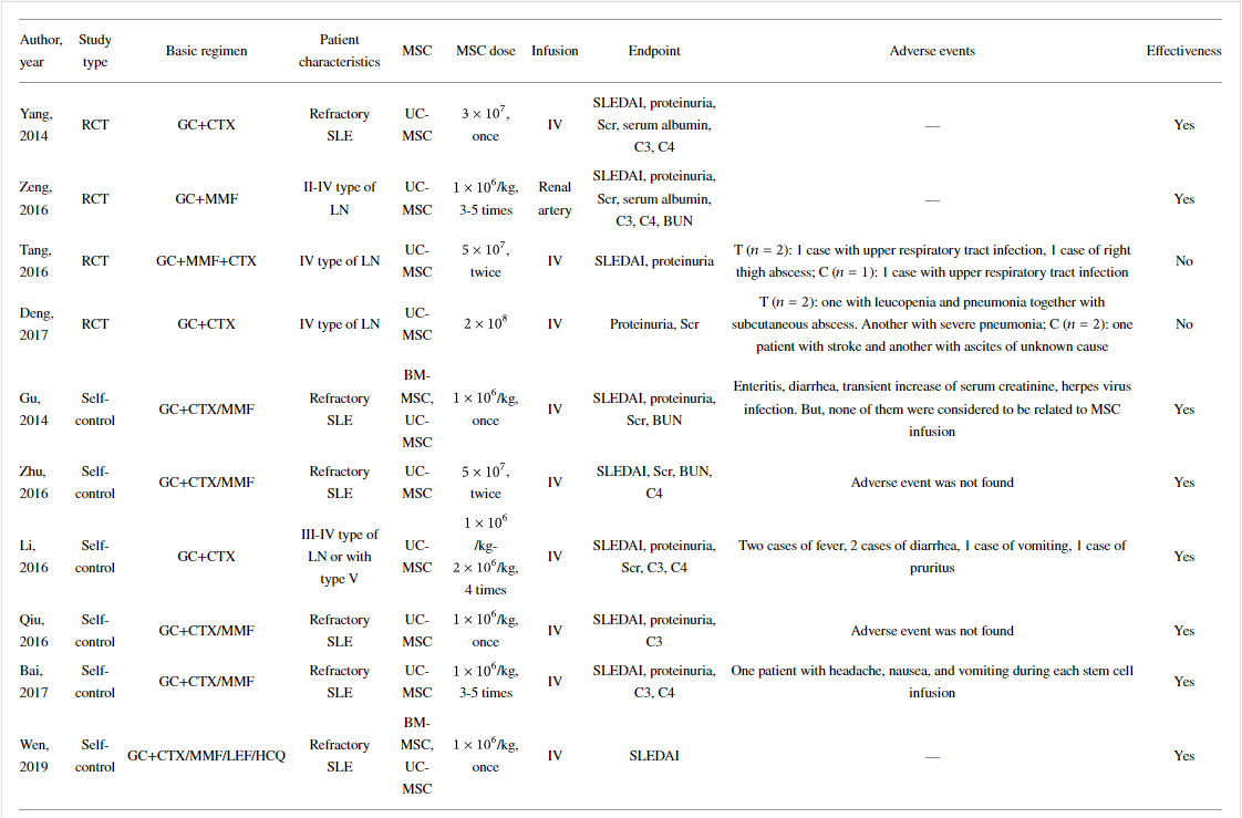 結果:在RCT中,結果表明MSC組在3個月和6個月時的蛋白尿低于對照組,MSC組在2個月和6個月時顯示出低于對照組的 SLEDAI。此外,, 95% CI: 0.07, 0.89,). 在病例系列試驗中,結果表明MSC組在1個月、2個月、3個月、4個月、6個月和12個月時蛋白尿較低。總之,間充質干細胞可能是SLE患者有前途的治療藥物。