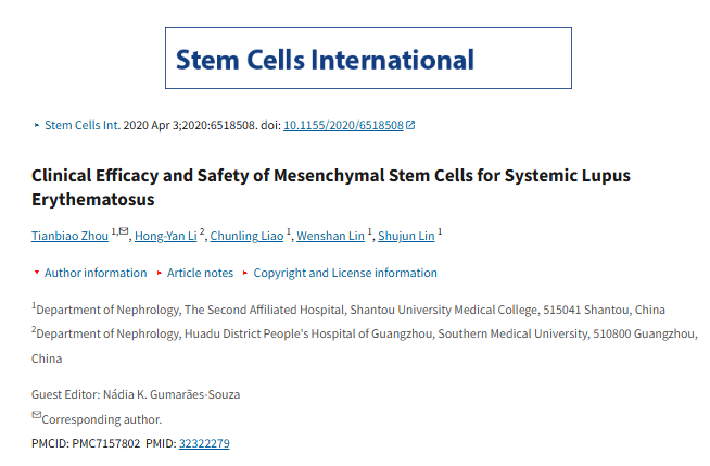 2020年4月3日,汕頭大學醫(yī)學院在國際期刊《Stem Cell International》上發(fā)布了一篇《間充質干細胞治療系統(tǒng)性紅斑狼瘡的臨床療效及安全性》的研究結果。