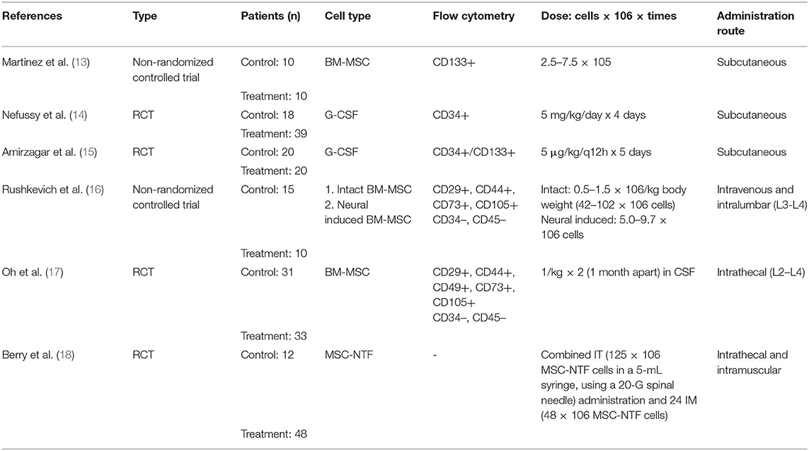 納入的研究使用了以下給藥途徑:皮下、鞘內和肌內聯合給藥、靜脈注射后腰椎注射和鞘內給藥。在六項研究中,三項使用粒細胞集落刺激因子 (G-CSF) ,其余使用骨髓間充質干細胞 (BM-MSC) 。
