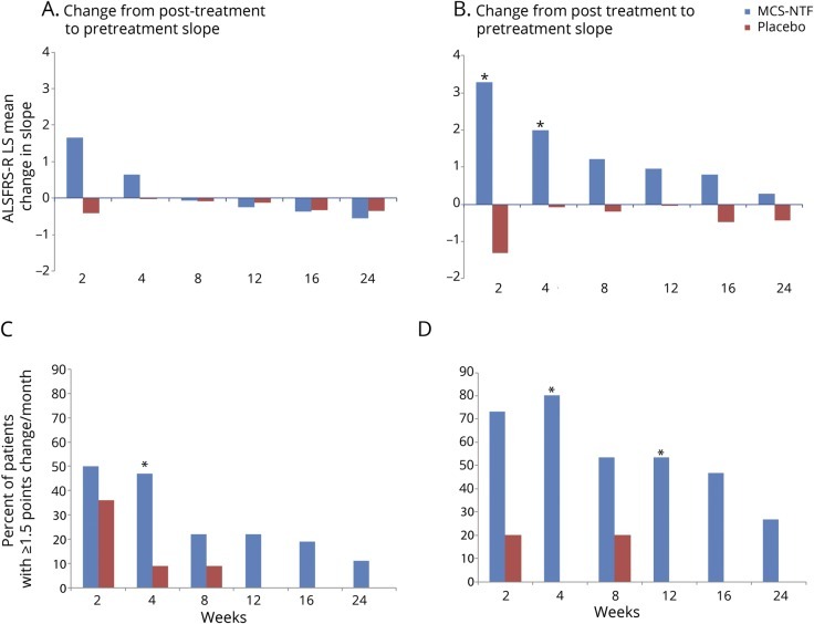 移植后ALSFRS-R斜率的變化在2周 ( p=0.110)時為+1.7點/月 (MSC-NTF) 和-0.4點/月(安慰劑),以及+0.6點/月(MSC-NTF) 和 -0.03 分/月(安慰劑)在4周時 ( p=0.368)。8周后,兩個治療組的斜率變化相似(圖2A)。