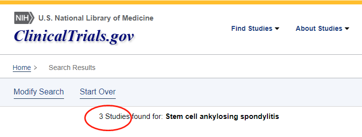截止2022年11,在美國國立衛(wèi)生研究院的最大臨床試驗(yàn)注冊庫clinicaltrials.gov網(wǎng)站上注冊的有關(guān)干細(xì)胞治療強(qiáng)直性脊柱炎的臨床研究項(xiàng)目有3項(xiàng)。