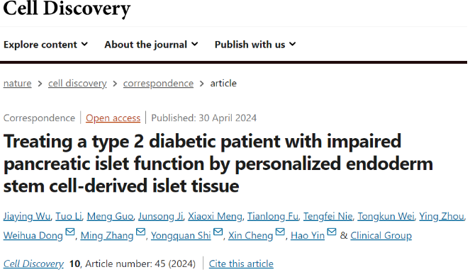 2024年4月30 日,海軍軍醫大學第二附屬醫院(上海長征醫院)殷浩教授團隊聯合中國科學院分子細胞科學卓越創新中心程新教授團隊,在權威雜志Cell Discovery(中科院1區,IF=33.5)在線發表了題為“利用個性化內胚層干細胞來源的胰島組織治療胰島功能受損的 2 型糖尿病患者”的研究成果。