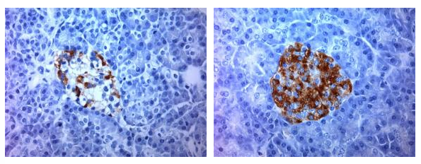 在左圖中,我們可以看到制造的胰島素減少(以棕色顯示)和腫脹,因為β細(xì)胞受損。