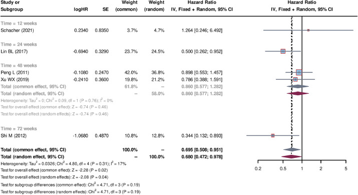 多項研究表明,干細胞治療(SCT)聯合標準藥物治療(SMT)或血漿置換(PE)可顯著改善肝衰竭患者的生存率。與單純SMT相比,SCT+SMT組的合并風險比(HR)為0.695,提示聯合治療能有效延長生存時間;而SCT+PE組的合并HR為0.487,進一步驗證了干細胞療法的附加價值。異體干細胞治療效果優于自體干細胞,深靜脈單次注射和外周靜脈多次注射均能顯著提升生存率,但異體干細胞的生存改善更明顯。
