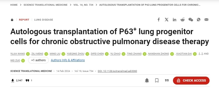 [9]Yujia Wang et al.,Autologous transplantation of P63+ lung progenitor cells for chronic obstructive pulmonary disease therapy.Sci. Transl. Med.16,eadi3360(2024).DOI:10.1126/scitranslmed.adi3360