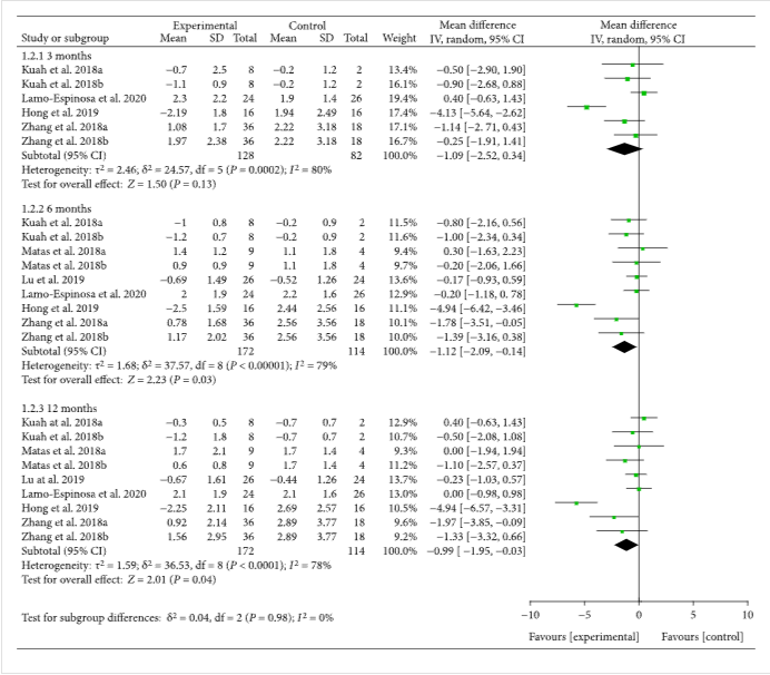 主要結果表明,MSCs可以在第3個月的隨訪中減少WOMAC疼痛和VAS[WOMAC 疼痛:-3.81(-6.95,-0.68),. VAS:-1.11(-1.53??,-0.68),效果至少持續12個月【WOMAC痛:-4.29(-7.12,-1.47),. VAS:-1.77(-2.43,-1.12)。MSC還可以在第6個月的隨訪中降低WOMAC硬度和身體功能 [WOMAC 硬度:-1.12(-2.09,-0.14)。WOMAC物理機能:-4.40(-6.84,-1.96),】,效果至少持續12個月【WOMAC剛度:-0.99(-1.95,-0.03)。WOMAC物理機能:-3.26(-5.91,-0.61)。WOMAC疼痛、VAS、WOMAC僵硬和WOMAC身體功能的改善可能具有臨床意義。