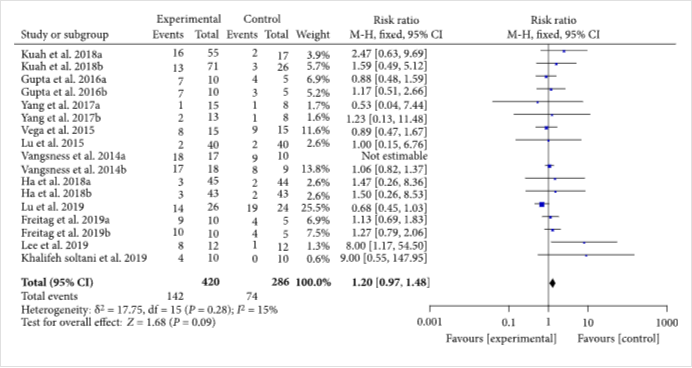 十項隨機對照試驗報告了不良事件的數量或頻率。異質性檢驗表明異質性較低(%,); 因此,采用固定效應模型進行分析。結果表明,MSC注射液與對照組的安全性無顯著差異[1.20(0.97,1.48),](圖5)。其他隨機對照試驗,所有人都沒有報告嚴重的不良事件。