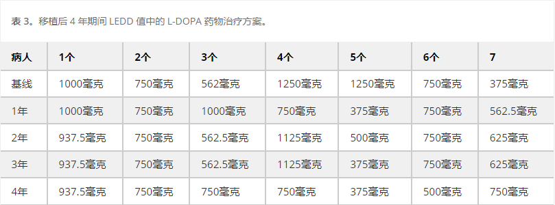 手術后4年,7名患者中有6名患者的UPDRSIII評分與基線相比有所改善,這一事實使我們能夠表明NPC可以阻止或逆轉PD的進展。與第一年結果相比,手術后2年出現一定程度的惡化,可以解釋為效果減弱的跡象。然而,與第一年相比,第二年的惡化在第四年發生逆轉,這表明NPC的恢復機制需要更長的時間才能充分發揮其潛力。
