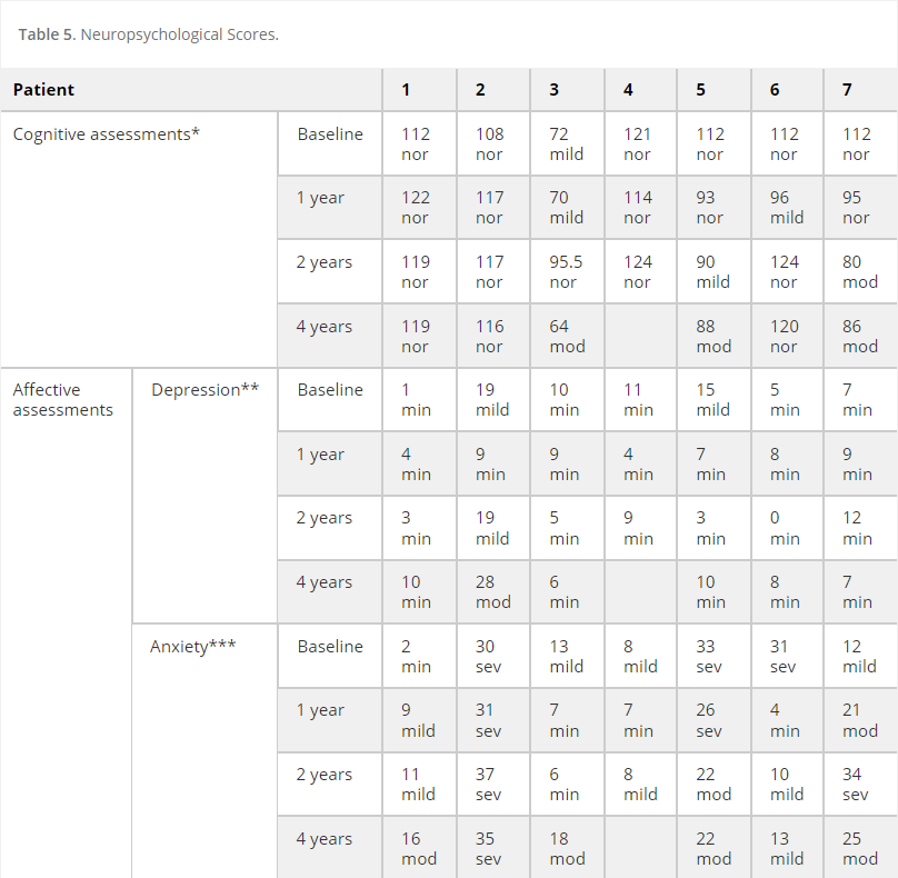 神經心理學評分如表5所示。在基線時,所有患者的認知表現均正常,但P3除外,其表現受到輕微影響。手術后,他們在術后1、2和4年的認知評估對所有患者都令人滿意,并且僅顯示出微小的變化(如果有的話)。關于他們的情感評估,在整個4年的術后研究期間,患者只有輕微的抑郁(患者2顯示中等評分),但確實表現出輕度至重度的焦慮水平,大多數患者在手術后保持不變,除了例外患者P5和P6似乎有所改善,而患者P7的焦慮從基線時的輕度變為嚴重2年,并在手術后4年減少回輕度。
