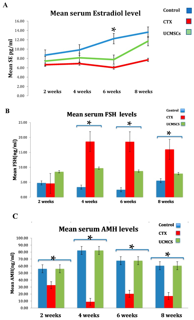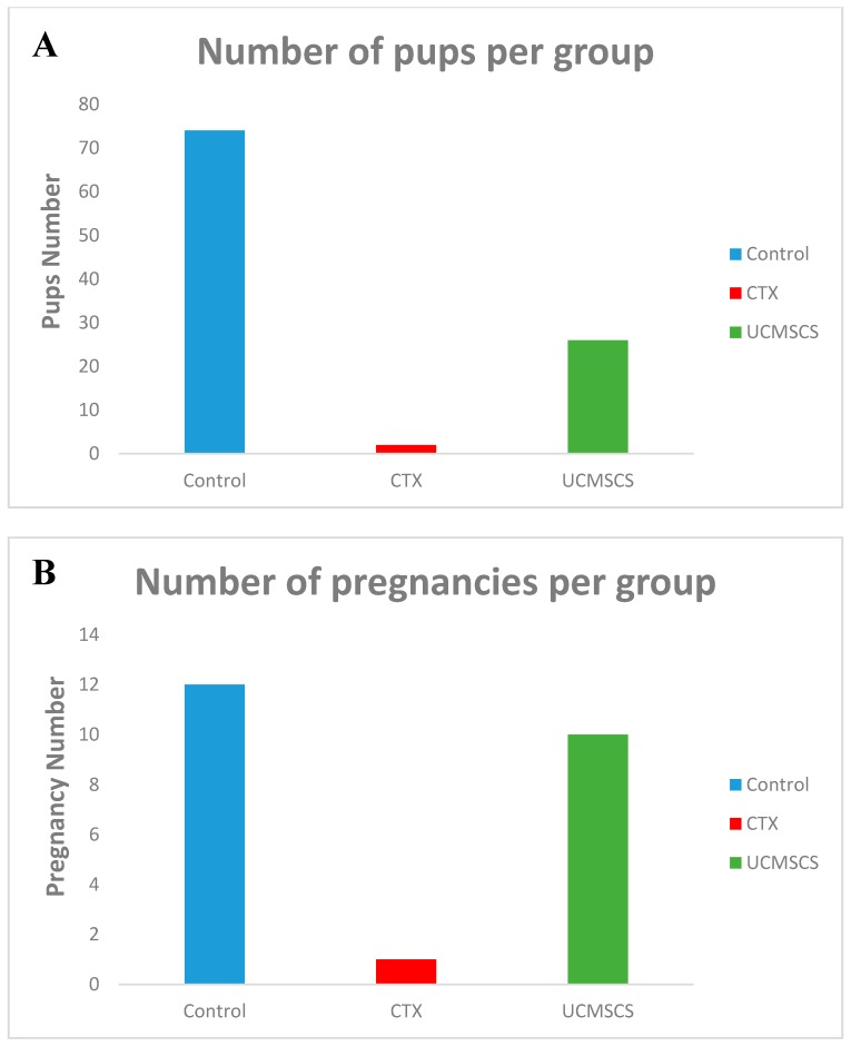 材料和方法:一項臨床前小鼠病例與載體對照隨機研究。三組中的每組都同時進行了兩個實驗。首先是證明UCMSCs恢復(fù)卵巢功能的能力。第二個是證明提高生育能力。總共36只小鼠被隨機分配;6只小鼠分成3組,每組進行2次實驗。第1組(對照組)、第2組(假化療)、第3組(干細胞)。