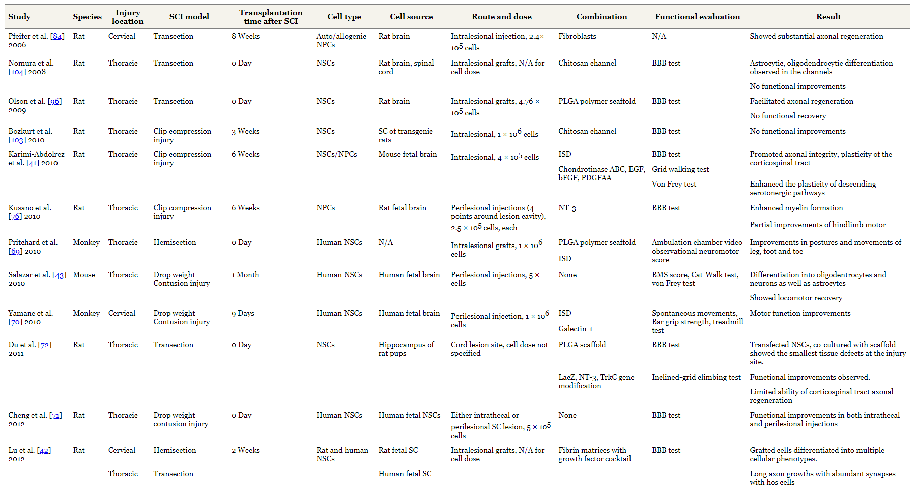表1總結了使用NSC的實驗研究的特點。NSC治療已在SCI的各個階段進行了測試:急性、亞急性和慢性。小鼠和大鼠是最常用的動物。
