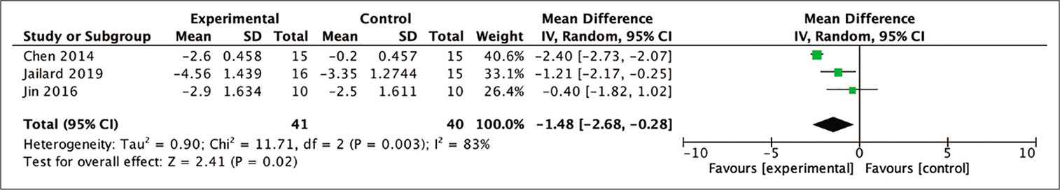 干細胞治療組的平均差異在統計學上更大,盡管這一結果沒有統計學意義(MD = -0.27;95% CI -0.52–0.17;P = 0.33;I2=93%)。